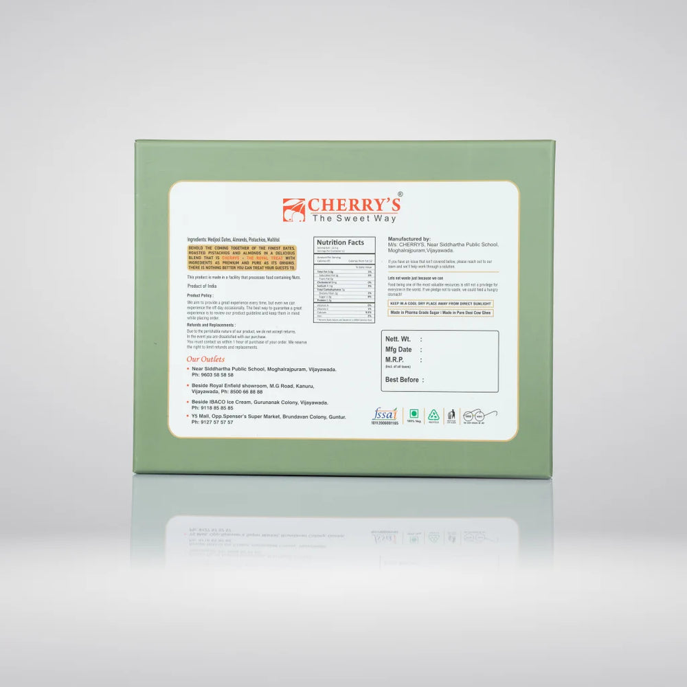 Cherry’s brings you a wholesome indulgence crafted with Medjool dates, the “king of dates,” known for their rich caramel-like sweetness and nourishing goodness. Blended with crunchy almonds, pistachios, and walnuts, this sweet is a perfect harmony of taste and health.